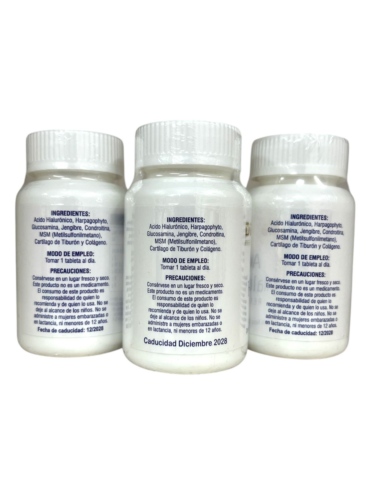 Ingredientes: Ácido Hialurónico, Harpagophyto, Glucosamina, Jengibre, Condroitina, MSM (Metilsulfonilmetano), Cartílago de Tiburón y Colágeno.